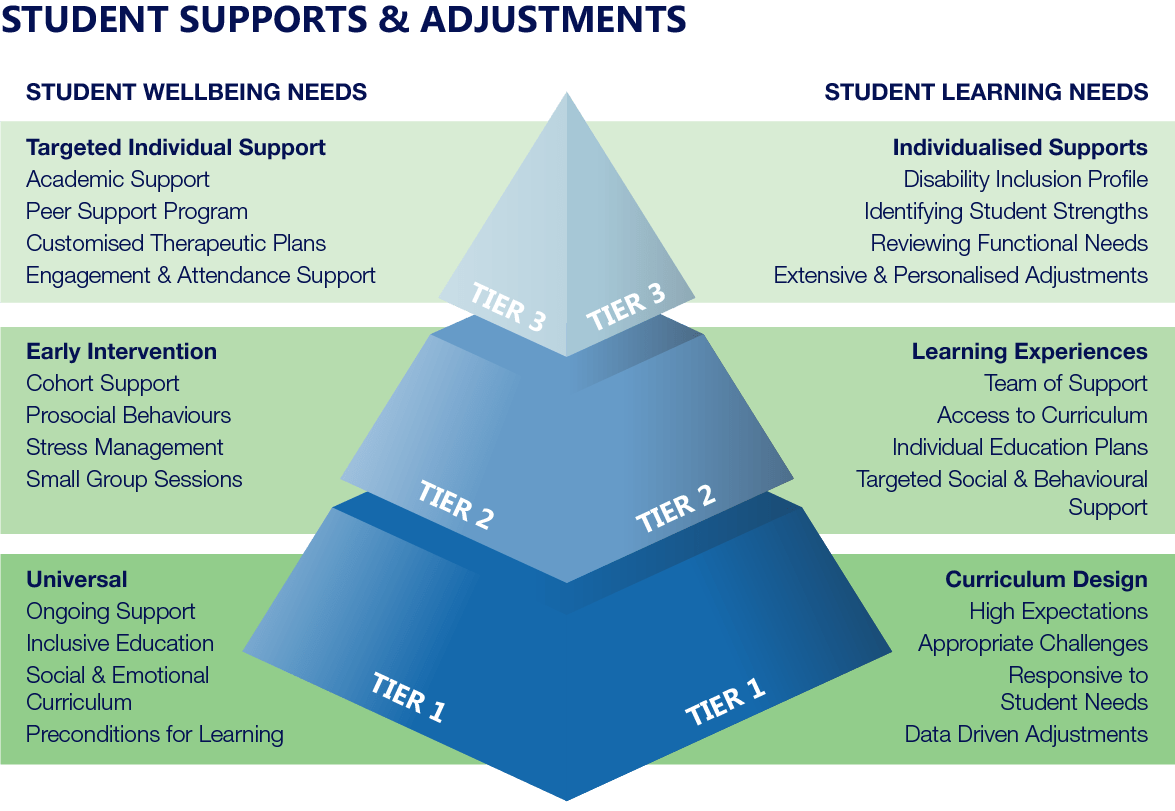 Support is delivered through a tiered model, ensuring students receive the right level of support at the right time.